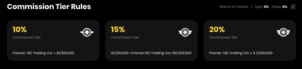 Note that on Apex Omni, commission is also divided into tiers; the exchange used the invited trader’s trading volume within a certain period to determine this.