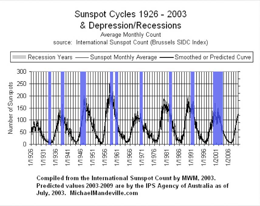 If we have a look at historical recessions and compare that to the sunspot cycle we can see that often when we see a recession, it goes along with a peak in the solar cycle. Although the chart below shows the period between 1926 - 2003, we can also see more recent market tops align with solar cycle peaks.
