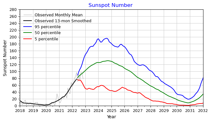 This graphic shows different solar activity predictions. Note that the blue line peaks out around the end of 2023 into the beginning of 2024. The green line is slightly later and the red line suggests we’ve already peaked. This is a rough estimate and therefore important to continue and view the sunspot cycle to determine whether the solar activity has peaked or not, it is possible that in practice it might take longer for the solar activity to peak.