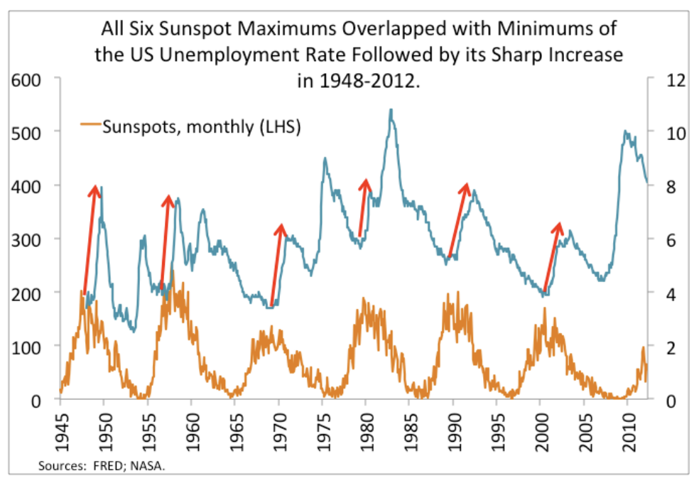 Solar cycle peaks also have been linked to the unemployment rate claimed by Mikhail Gorbanev.