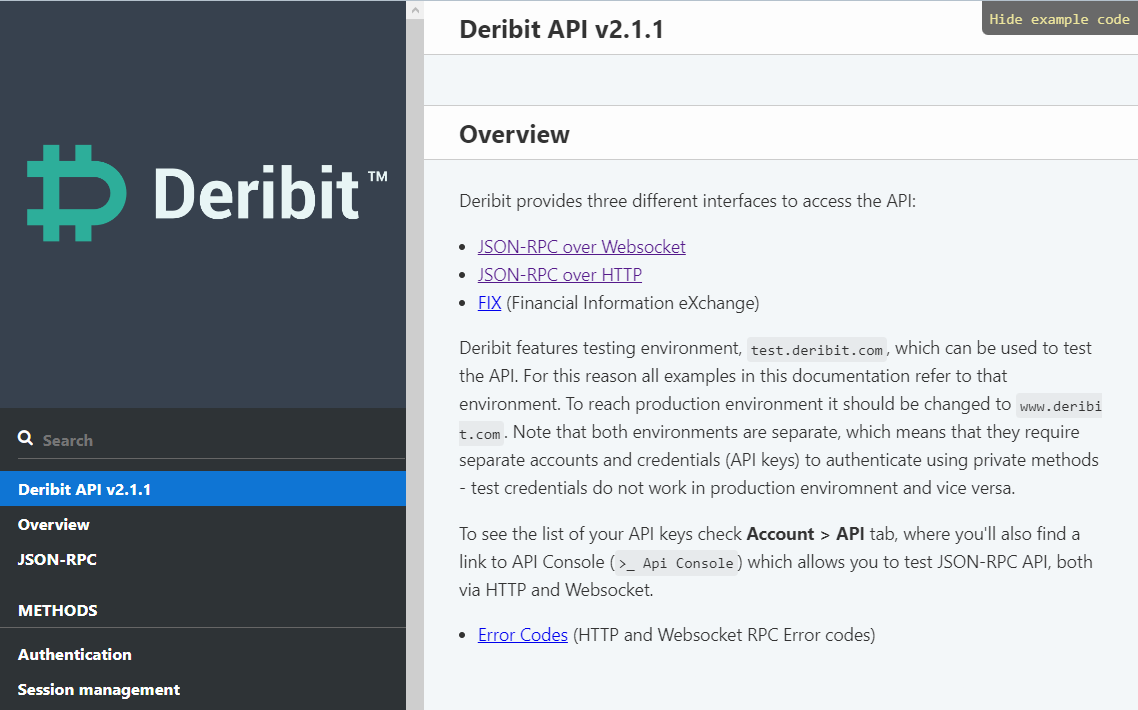 Deribit offers four different interfaces to access their API: JSON-RPC over Websocket, JSON-RPC over HTTP, Multicast and FIX (Financial Information eXchange). They provide a testing environment at test.deribit.com for users to test the API, and all examples in the documentation refer to this environment. To access the production environment, users should switch to www.deribit.com. Keep in mind that both environments are separate and require distinct accounts and credentials (API keys) for authentication when using private methods. Test credentials will not work in the production environment and vice versa.