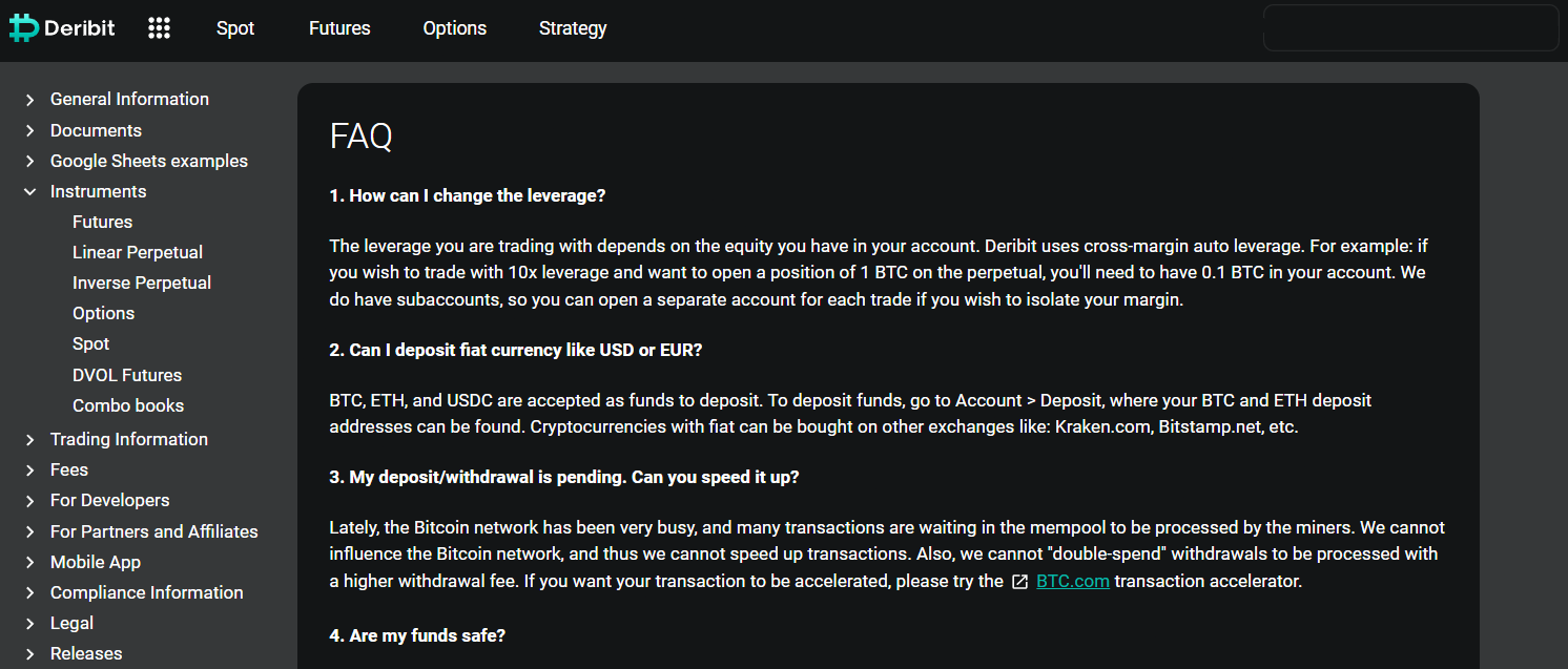 As for suitability for beginners, Deribit operates in the more complex world of derivatives, making it potentially less suitable for newcomers. Margin trading and leveraged trades introduce additional risks, making futures and options trading more appropriate for experienced traders. Nonetheless, Deribit offers a live testnet that allows users to practice trading with 10 BTC in demo funds, learn various strategies, and familiarize themselves with the interface and analytical tools. The platform also provides several resources, such as a blog, a Docs page, an FAQ page in the members section, and a YouTube channel with explanatory videos.